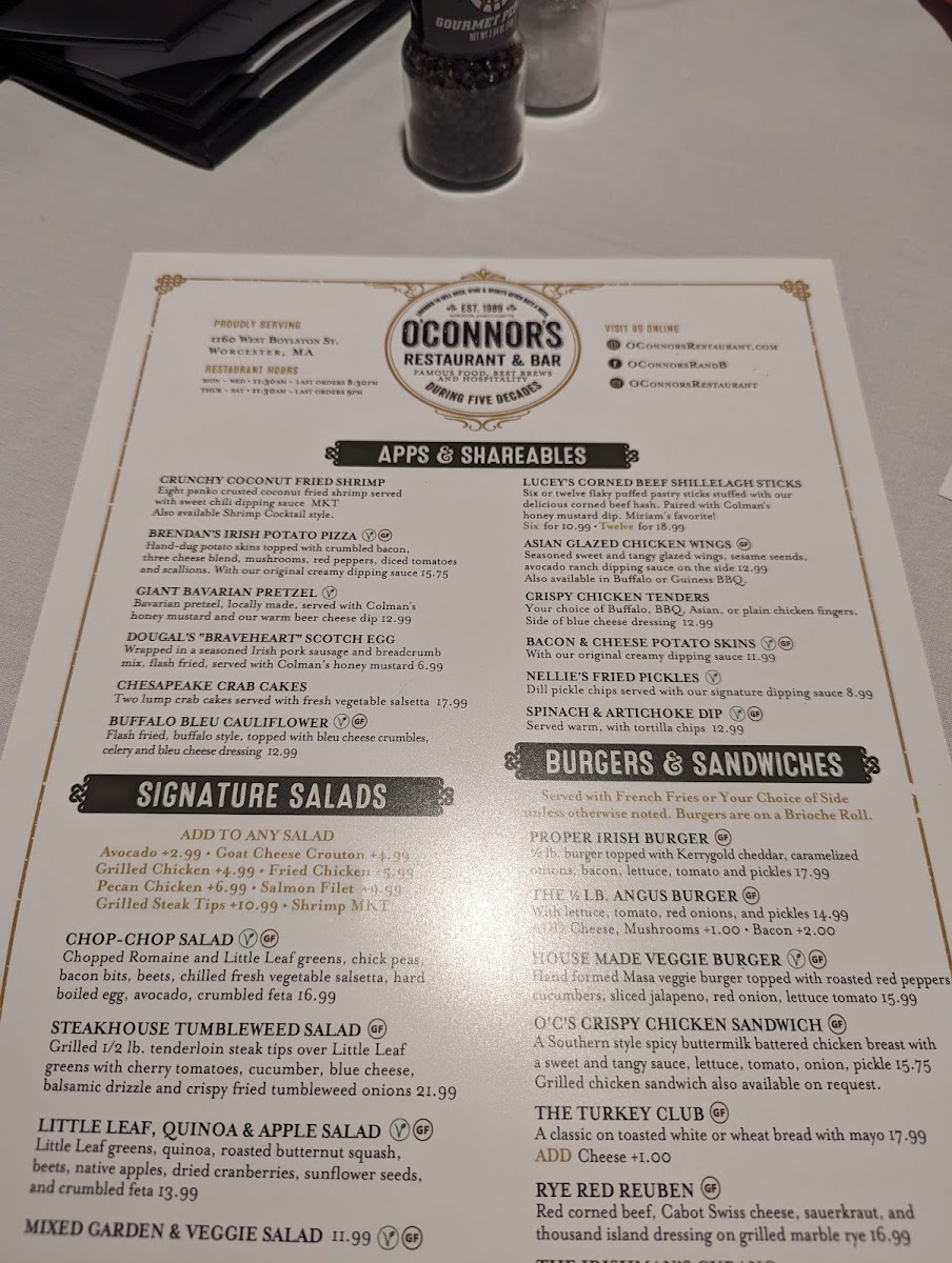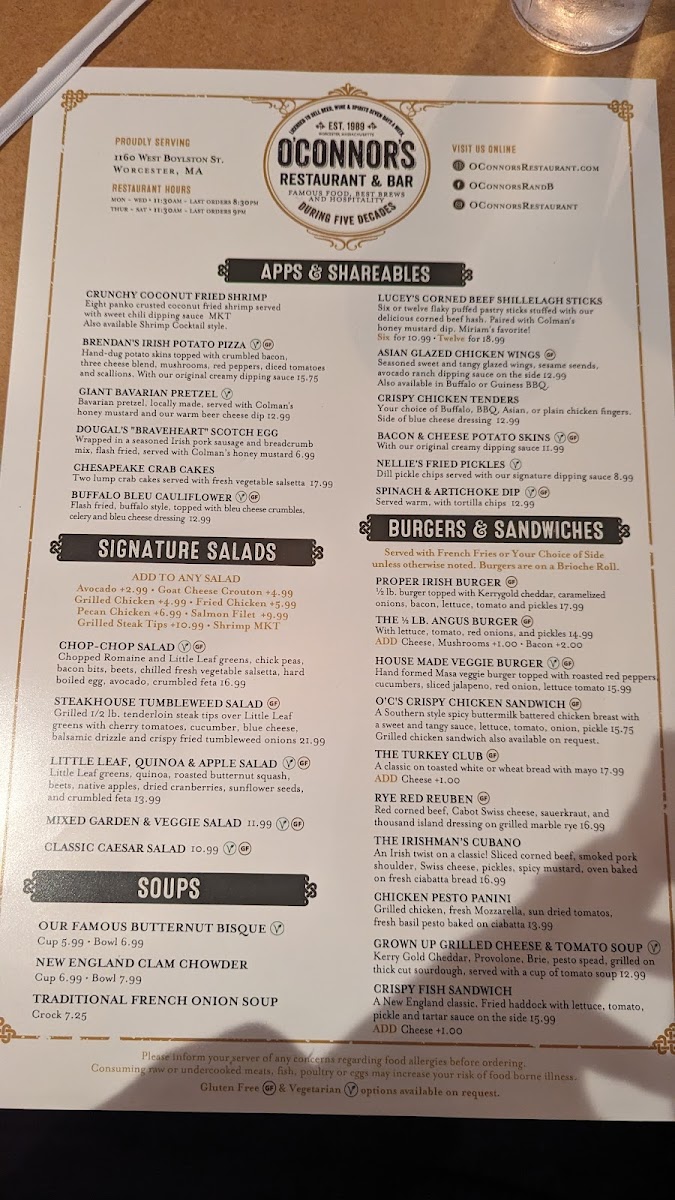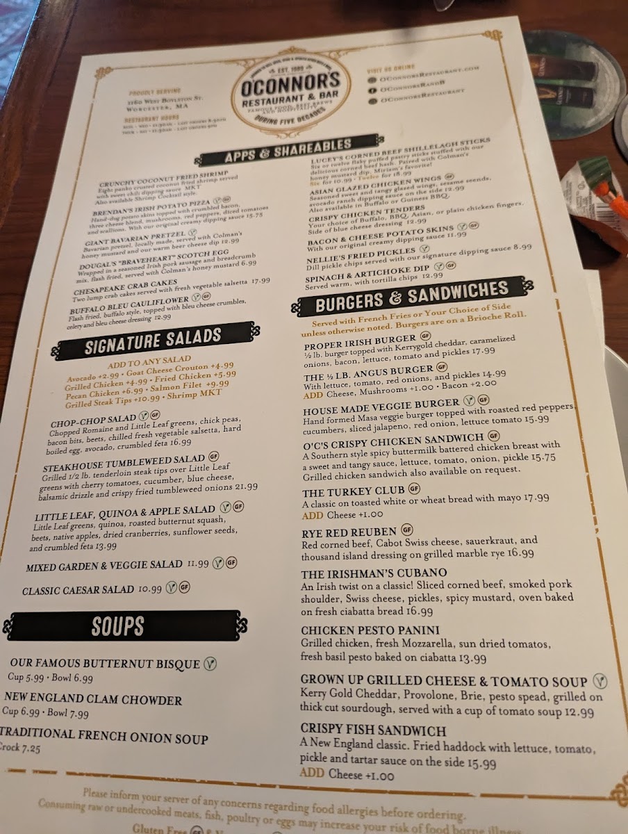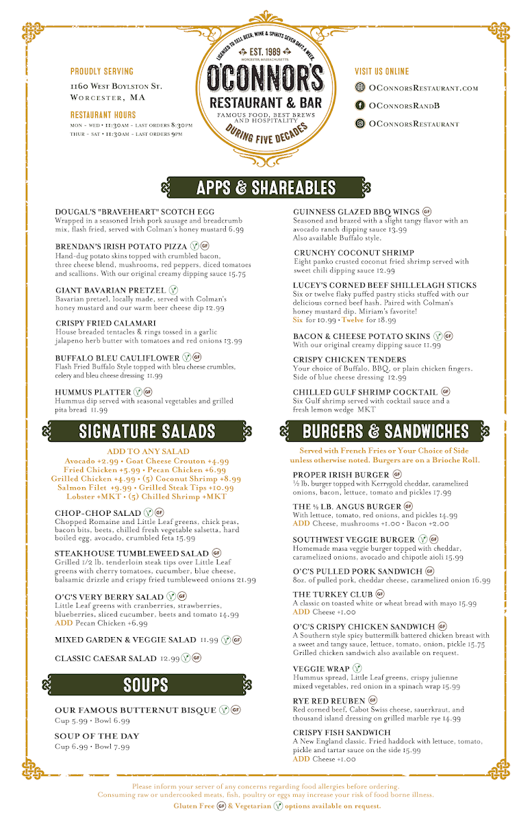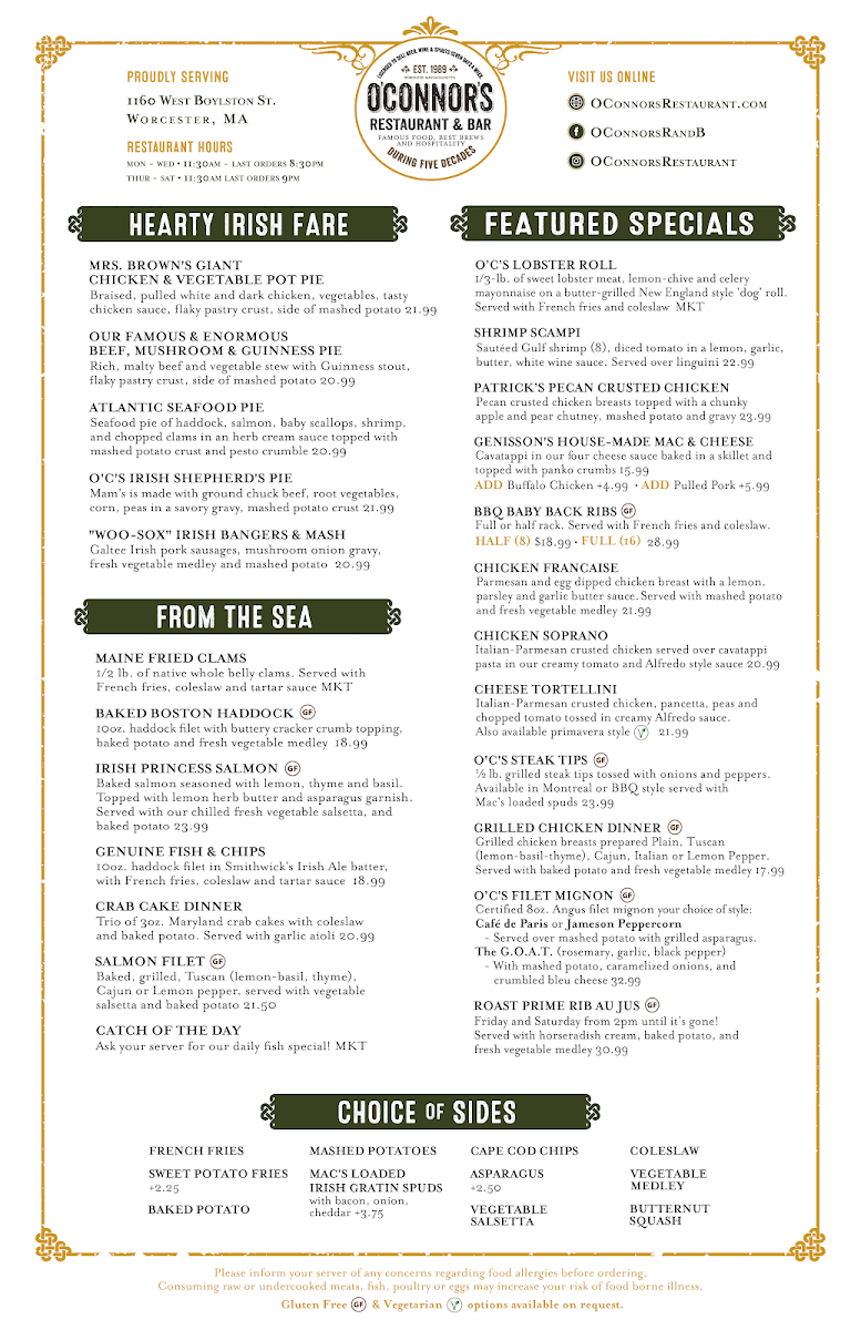 If you're in the mood for a cozy, vibrant spot to enjoy delicious food and drinks, the O'Connor's Restaurant & Bar Menu has something for everyone. Located at 1160 W Boylston St, Worcester, MA, this spot offers a diverse menu that’s sure to please both casual diners and food enthusiasts alike. Whether you're craving a hearty Irish-inspired dish, fresh seafood, or a classic comfort food, you'll find plenty of options to satisfy your appetite. Their bar menu is equally tempting, offering a great selection of beers, wines, and cocktails to pair with your meal. Each dish is thoughtfully prepared, with bold flavors and fresh ingredients that bring out the best in every bite. It's a welcoming place, perfect for a night out with friends or a casual dinner with family.